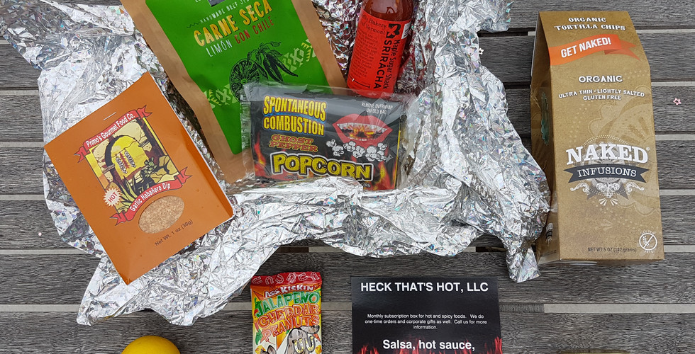 Everything spicy and nice in one subscription box. HECK THAT'S HOT subscription box is full of a variety of hot products. For only $30, you get a box with six items from national brands to handcrafted local sellers or smaller vendors. The items could be salsa, hot sauce, chips, nuts, popcorn, dips and more. Anything and everything they can find that his hot and spicy. Products will range from mildly spicy to ghost pepper hot. Each monthly box will help you familiarize yourself to not only the different spicy products, but each peppers heat range and flavor.